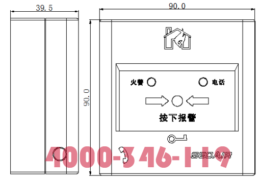 J-SAP-SCM20A型手動火災報警按鈕的外觀及安裝尺寸(含底座)如圖